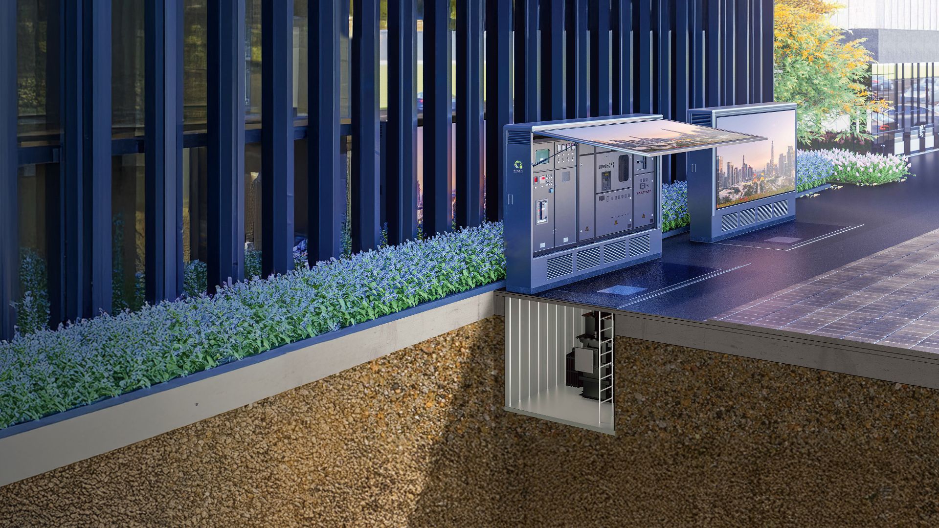 液浸式不燃配電變壓器水浸時可安全運行,置於地下,不占用地表空間。緊湊型高低壓電氣櫃置於地上, 外置(zhì)LED顯示(shì)屏或傳媒(méi)燈箱。城市戶外隱型配電係統以建設高質量城市戶外配電基礎設施為目標,綜合提升(shēng)戶外配電基礎設施消防安全、防汛能力、供電可靠性和外觀形象。